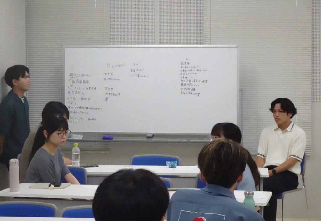 ハワイ大学・佐賀大学などで活用されているProblem based Learning形式で、腹痛患者のシナリオから考えられることに皆で取り組みました