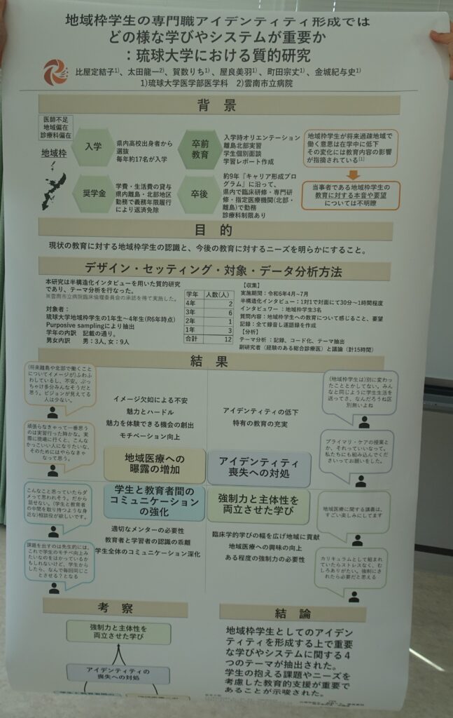 雲南市立病院の太田龍一先生のご指導のもと、研究成果をまとめました テーマは地域枠学生の専門職アイデンティティ形成に関するもので、当事者である自分たちの問題意識を具現化したものです