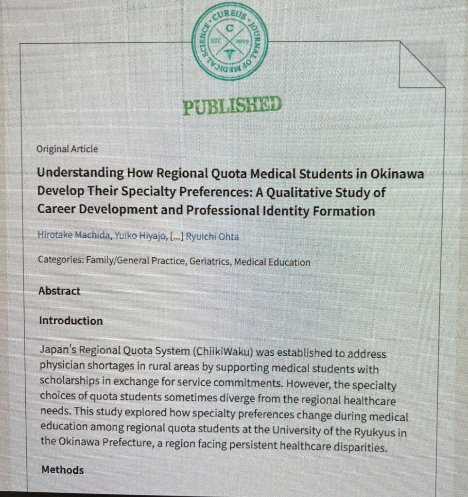 雲南市立病院の太田龍一先生のご指導のもと行った質的研究で、タイトルは, “Understanding How Regional Quota Medical Students in Okinawa Develop Their Specialty Preferences: A Qualitative Study of Career Development and Professional Identity Formation.”です(Cureus 17(12): e98550. doi:10.7759/cureus.98550)