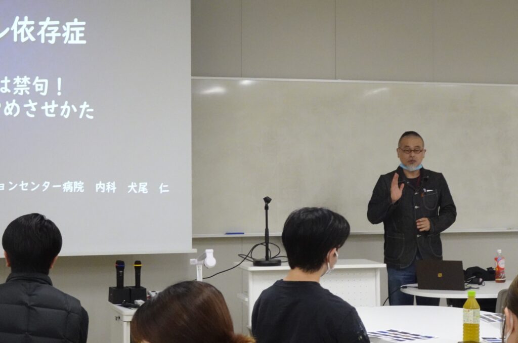 沖縄リハビリテーションセンター病院の犬尾仁先生による依存症の本質、だれでも依存症になりうる、お酒が唯一の杖になっている、医者はある意味無力であるが人と人をつなぐのが地域医療の本質、など様々な金言をいただきました。